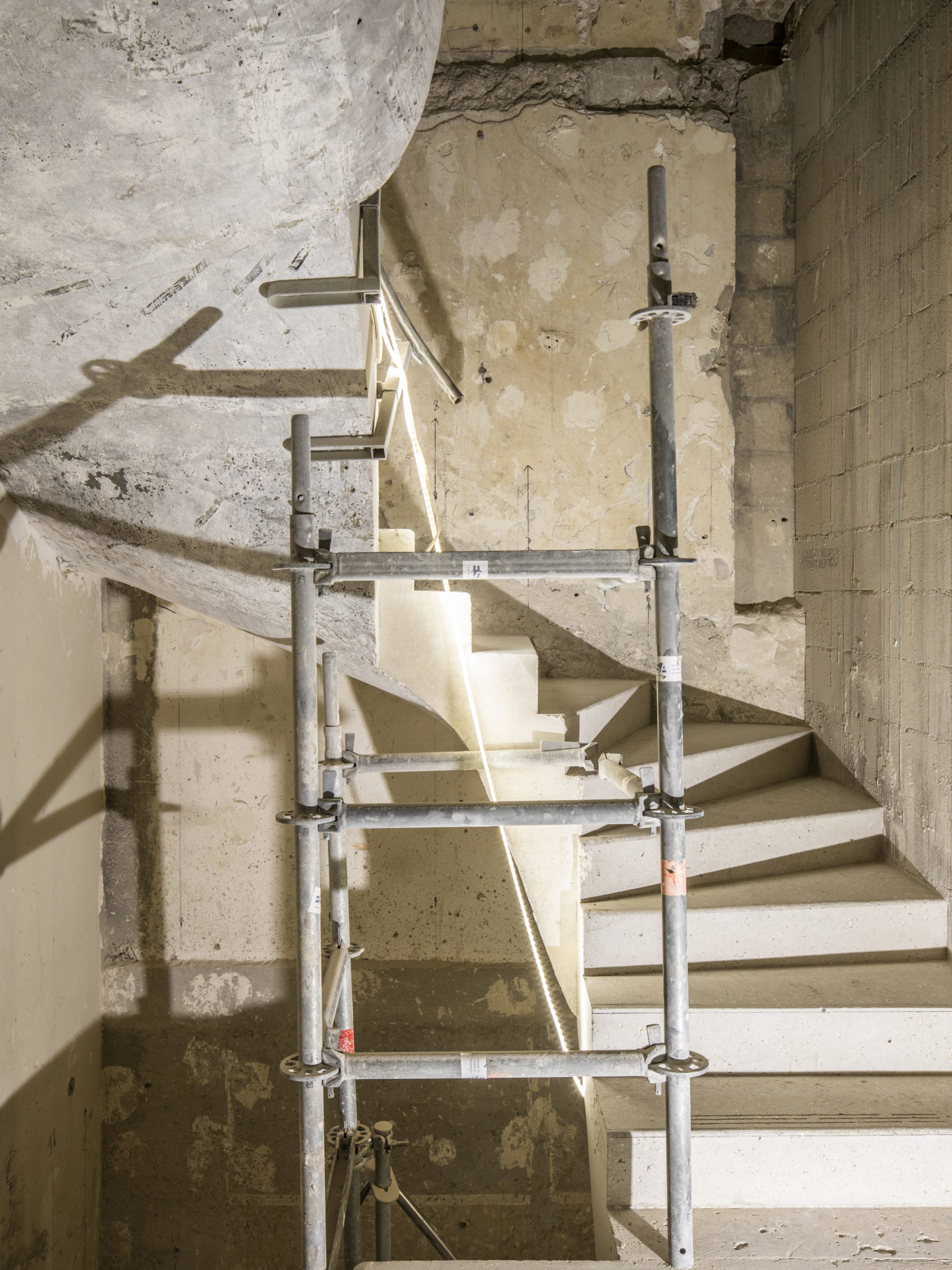 Création de deux escaliers balancés en béton coulés en place sur 7 niveaux.