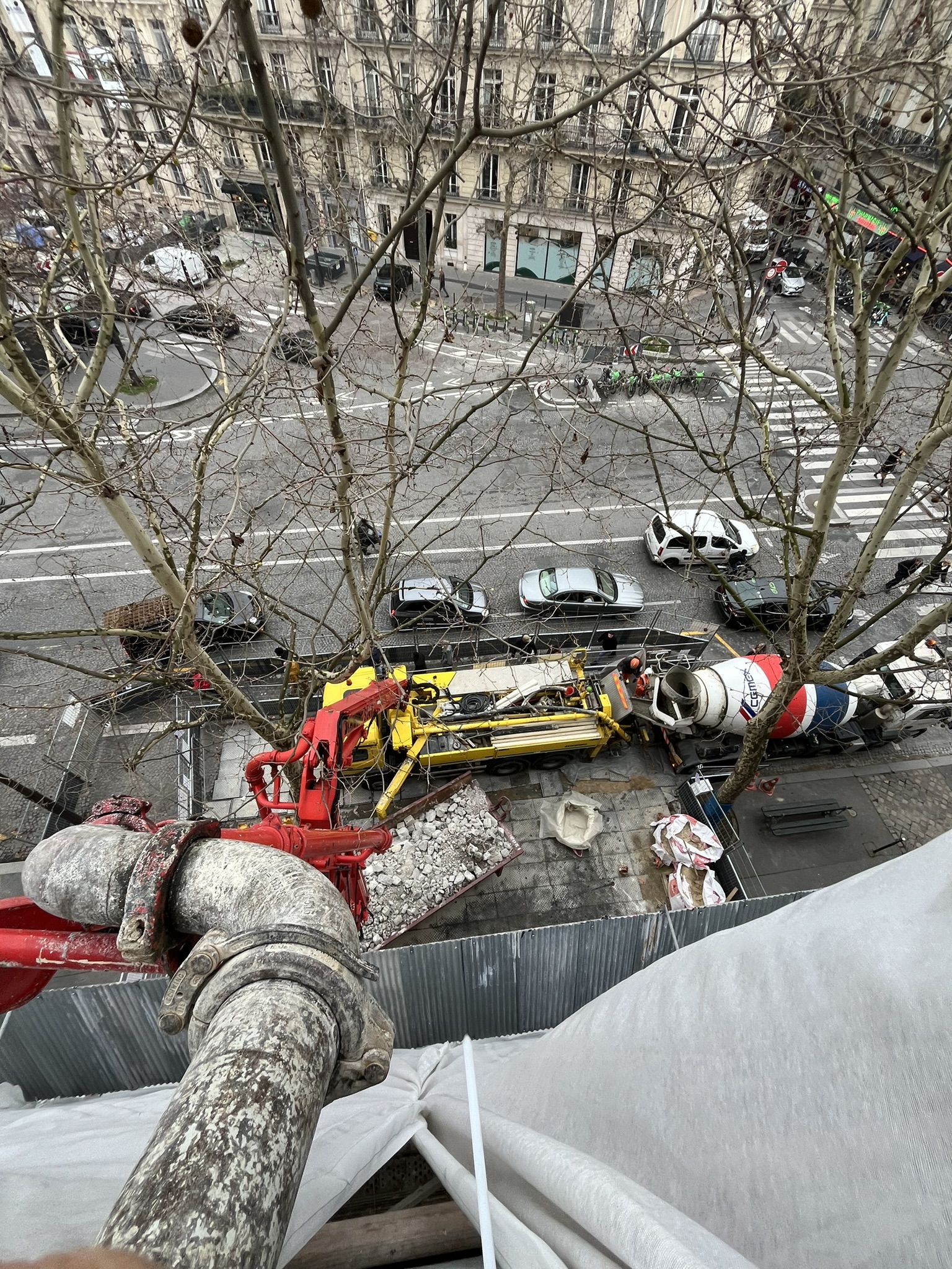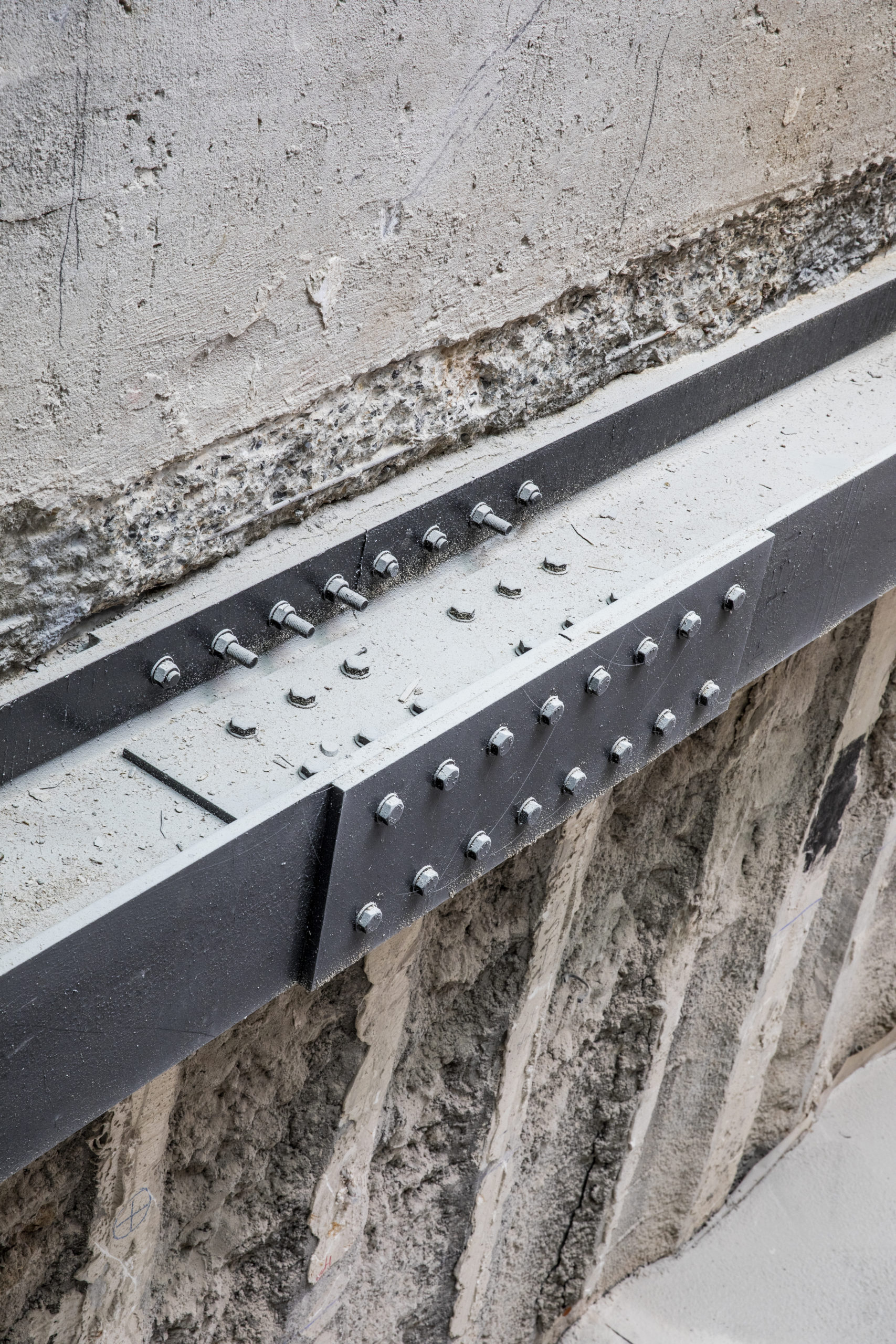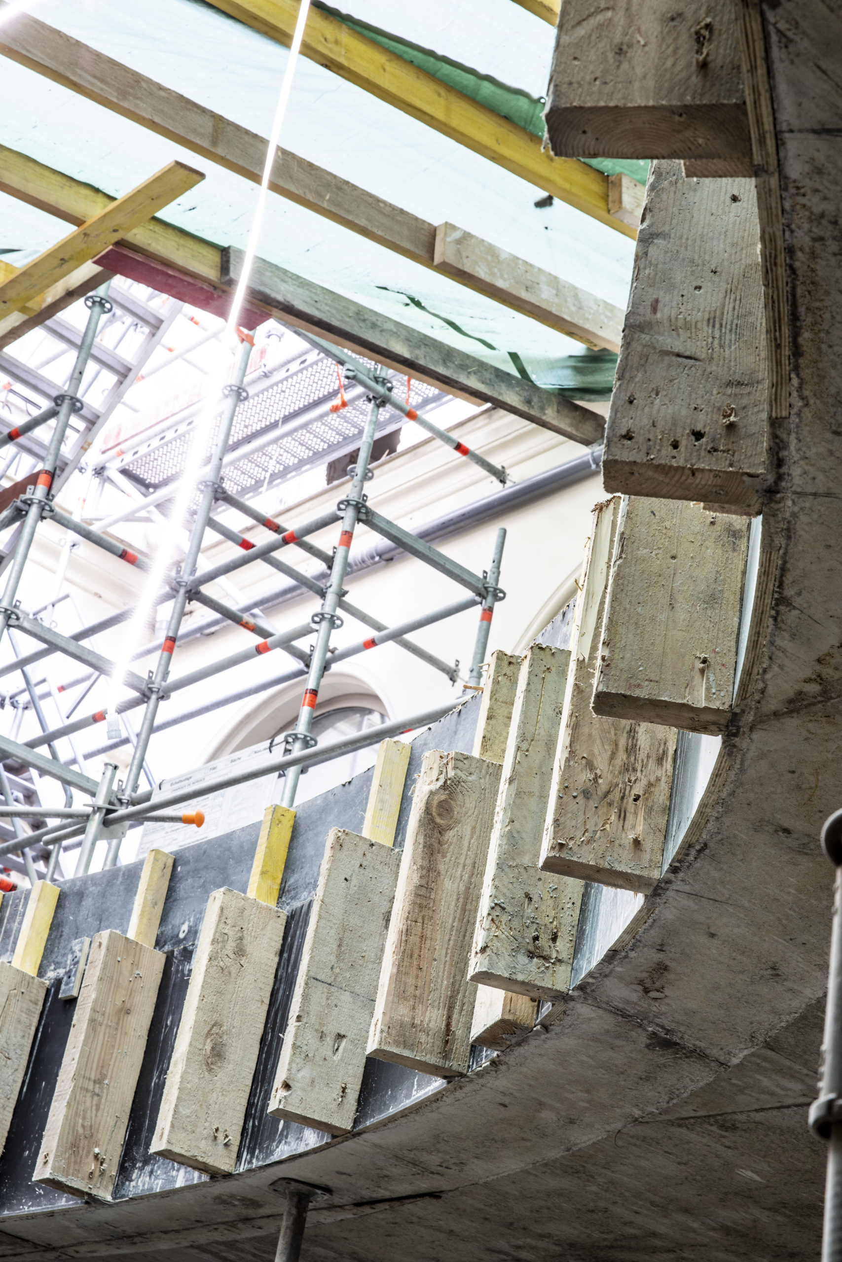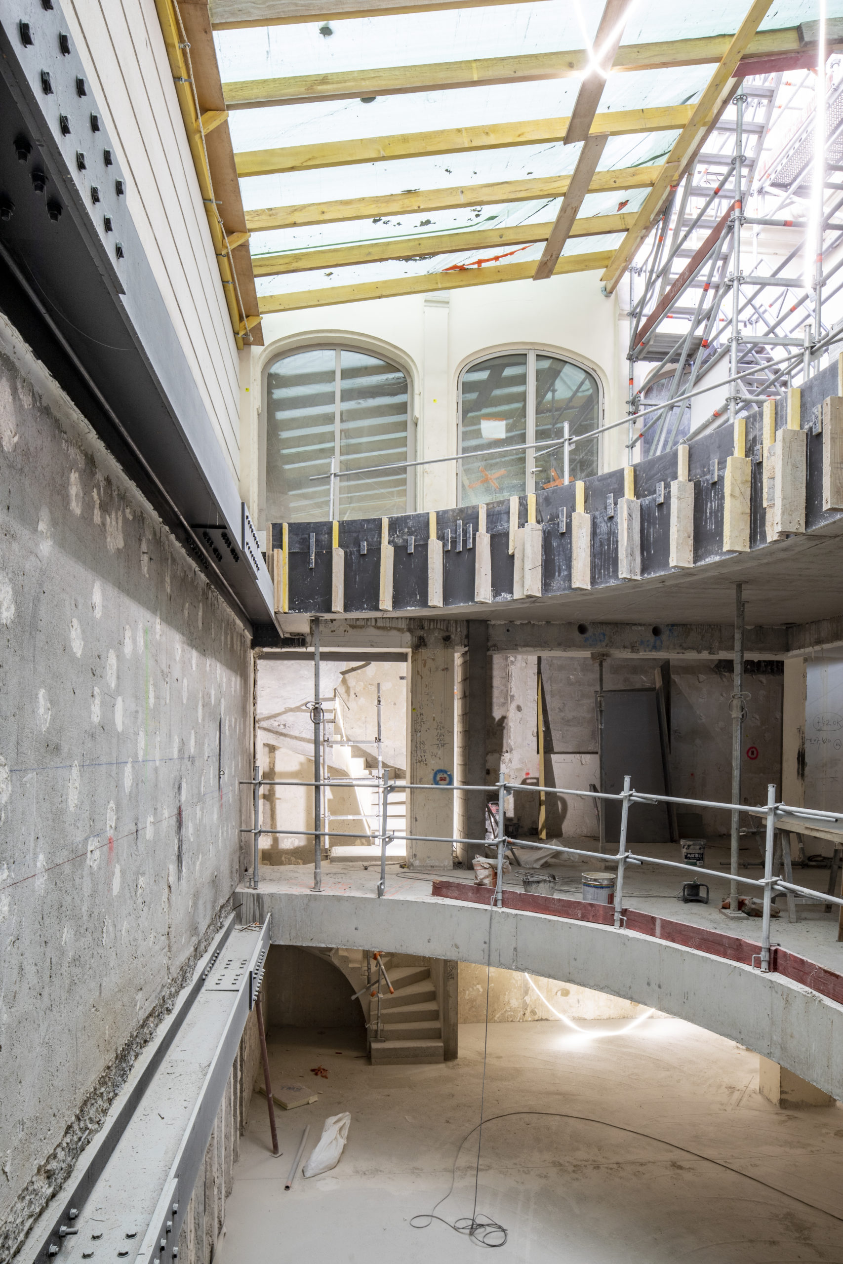 Création d’un puit de lumière : Contreventement d’un mur mitoyen par liernes métalliques, création de poutres cintrées et planchers en béton armé.