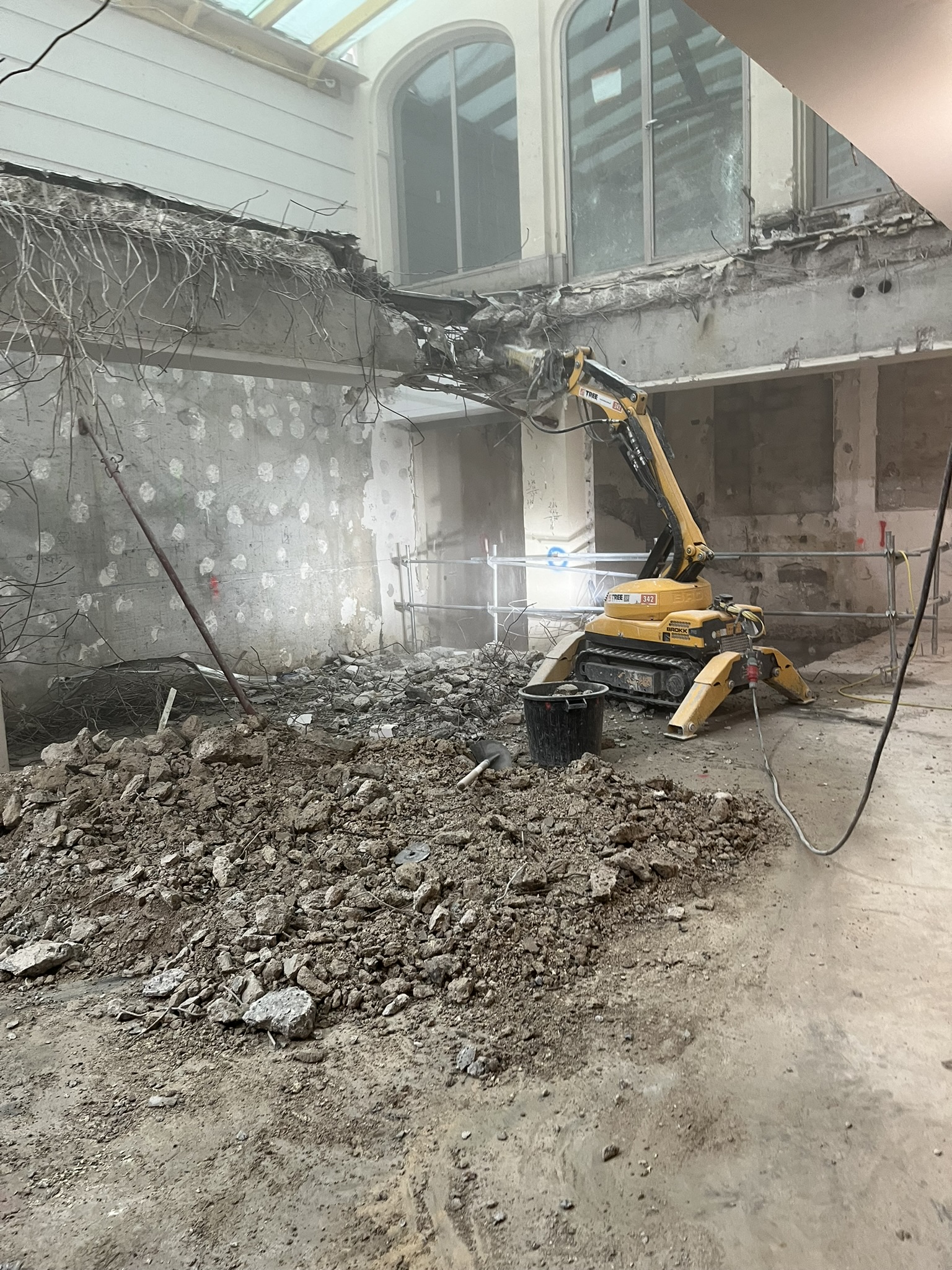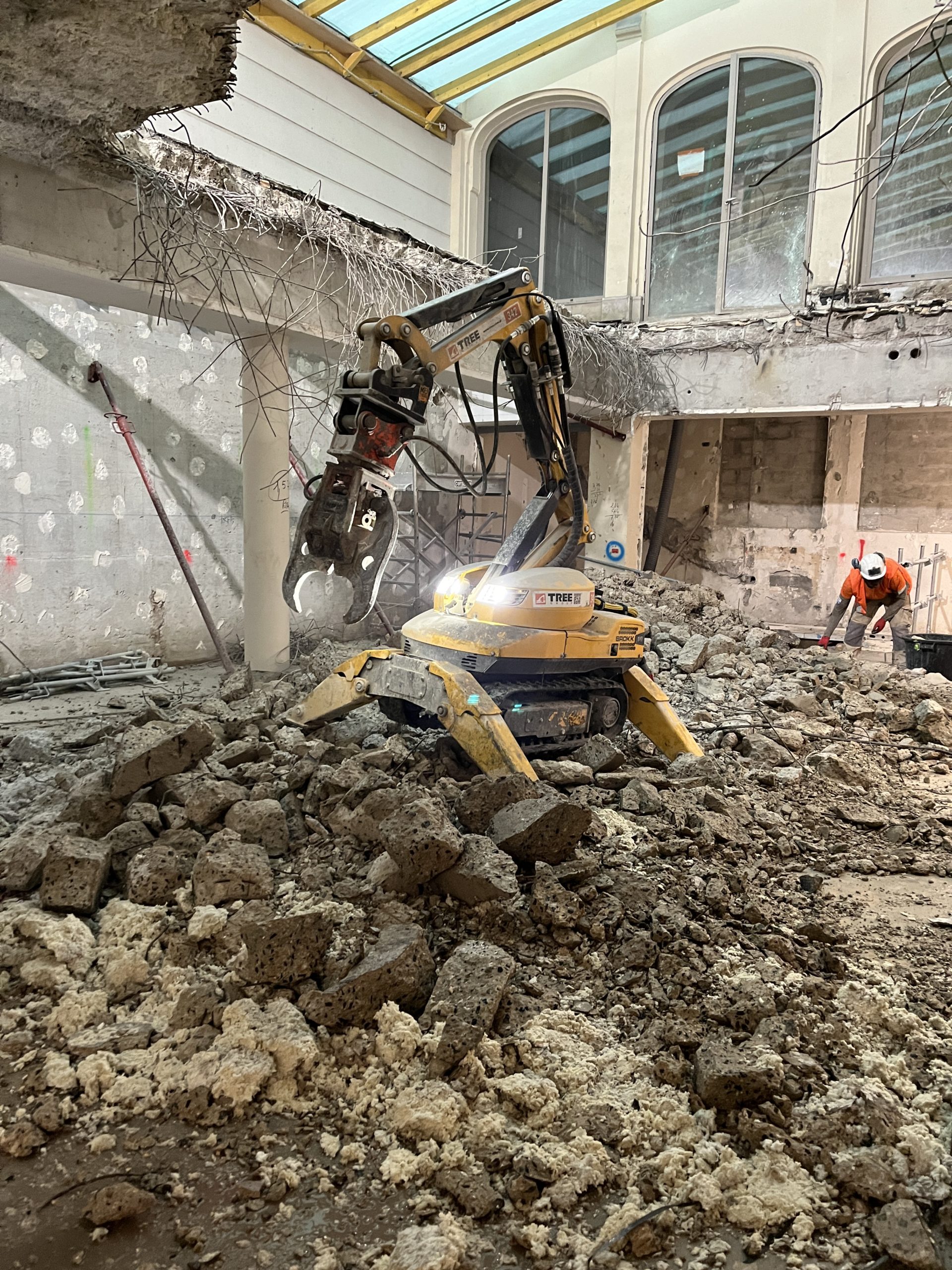 Démolition structurelle de planchers, escaliers et poteaux/poutres en béton armé au moyen d’une pince hydraulique montée sur Brokk 110.
