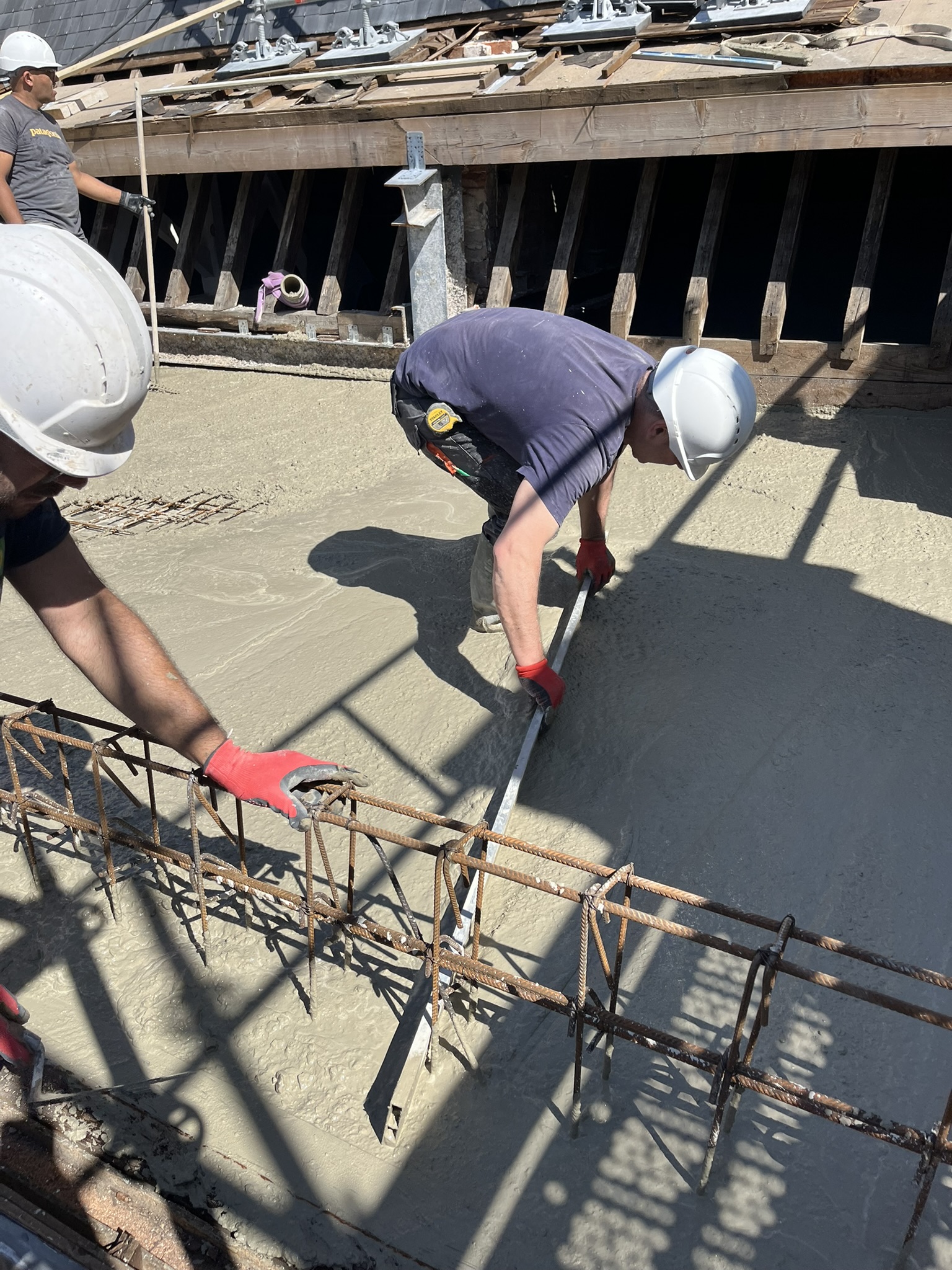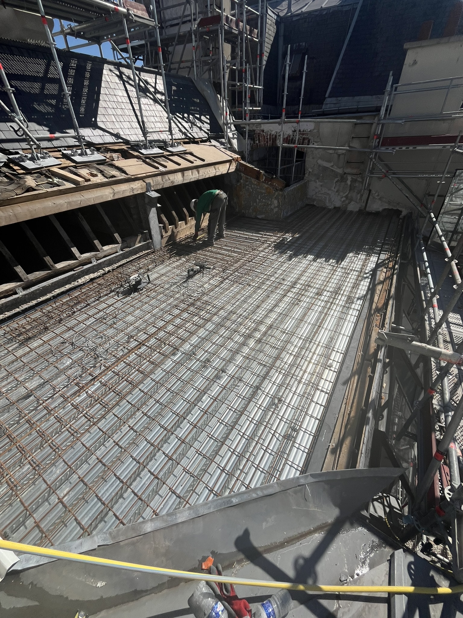 Nous avons en premier lieu effectué la démolition de deux escaliers de 6 niveaux, ainsi que de planchers en béton armé, afin de redéfinir les volumes intérieurs. Ensuite, nous avons réalisé deux phases de structure, comprenant la création d’escaliers balancés et de planchers neufs en coffrage traditionnel, ainsi que des ouvrages spéciaux comme la création d’un puit de lumière dans la cour existante. Cet ouvrage a pour objectif de laisser entrer la lumière naturelle dans les espaces de travail aux sous-sols. Nous avons également créé une terrasse en structure métallique, rendue accessible par ascenseur, dont nous avons prolongé la gaine. Nous sommes aujourd’hui au terme de 18 mois de travaux, qui ont nécessité l’intervention de 2 à 5 équipes de démolisseurs, maçons, coffeurs, armaturiers et charpentiers métallique.