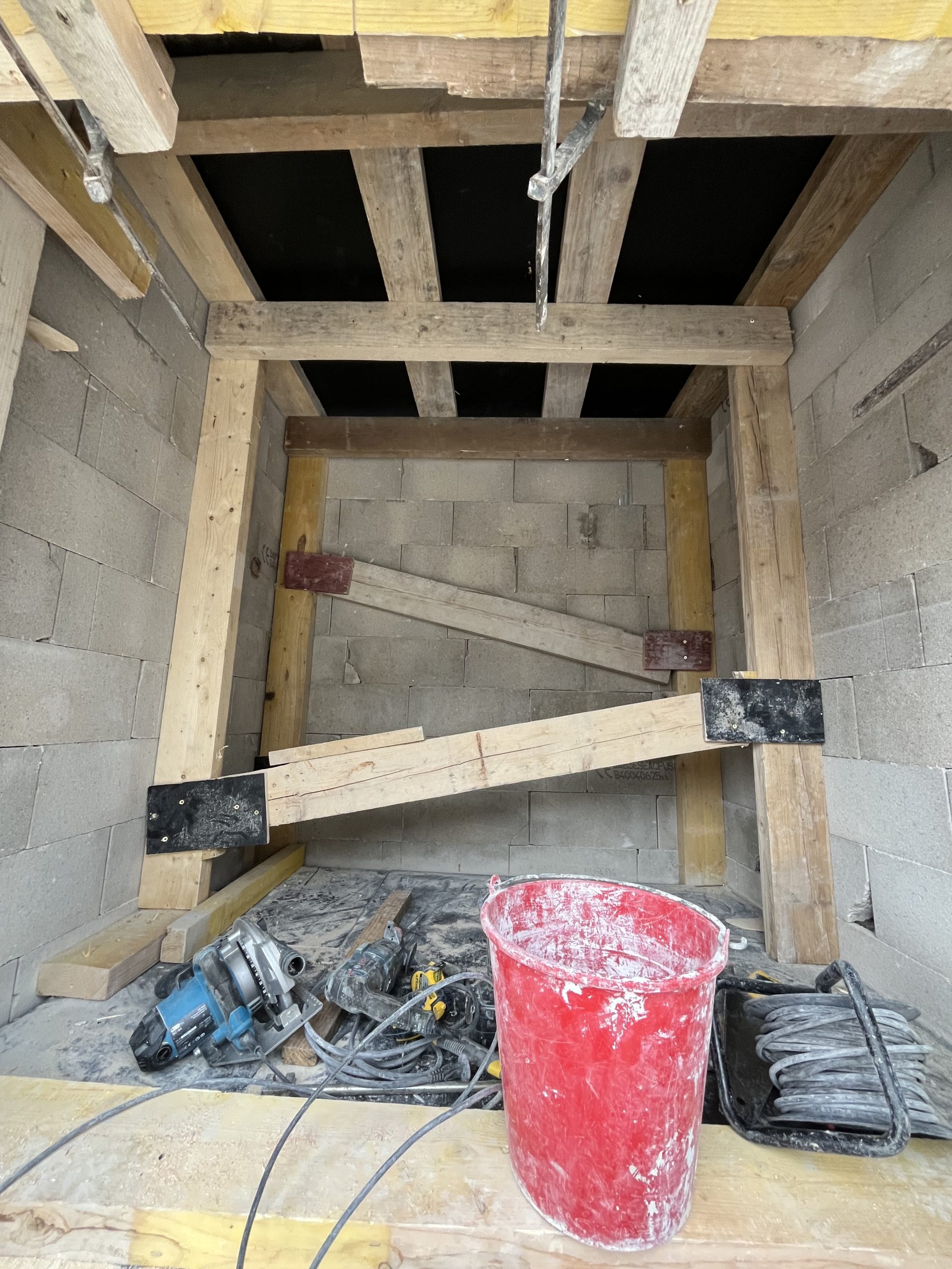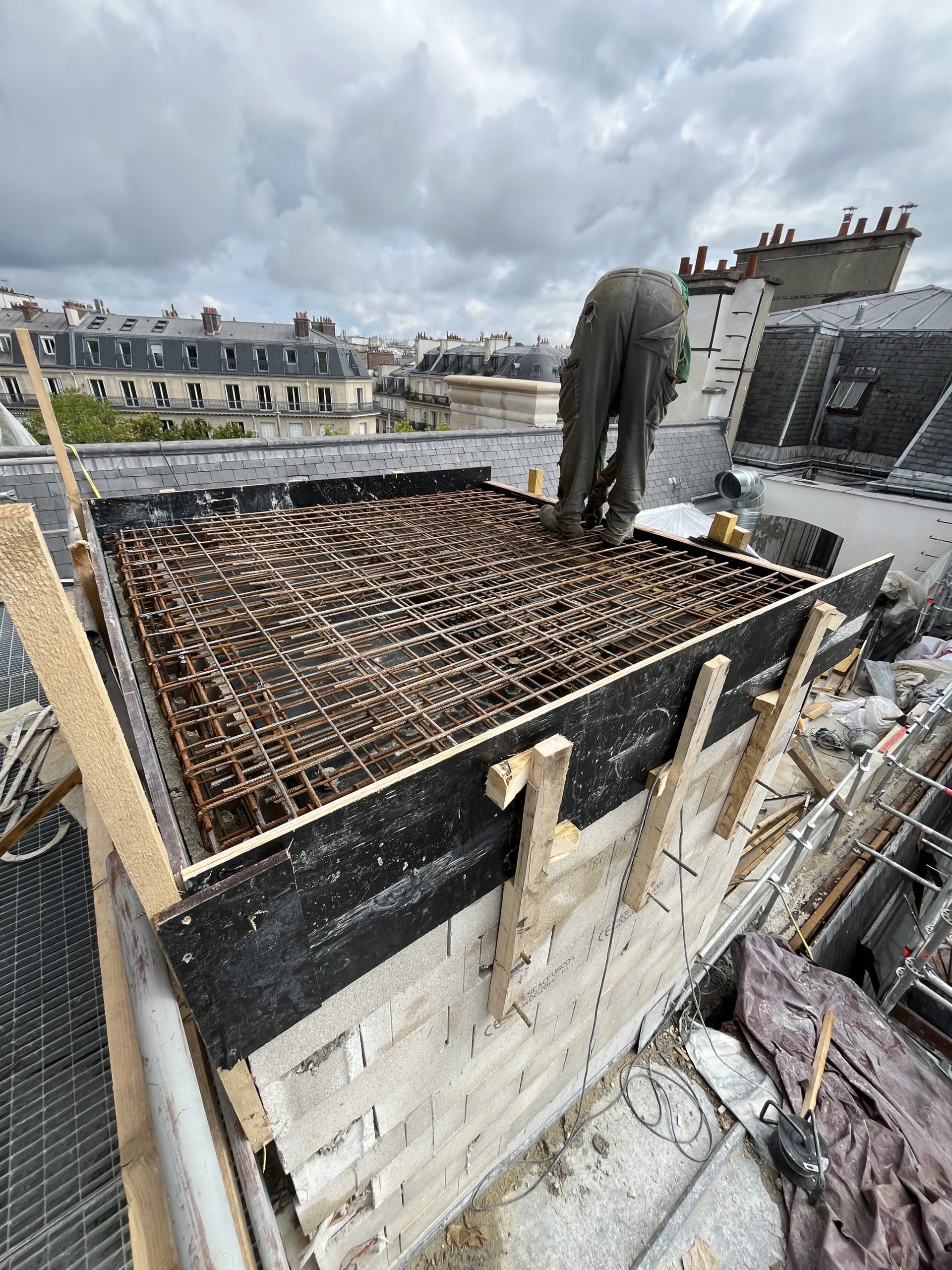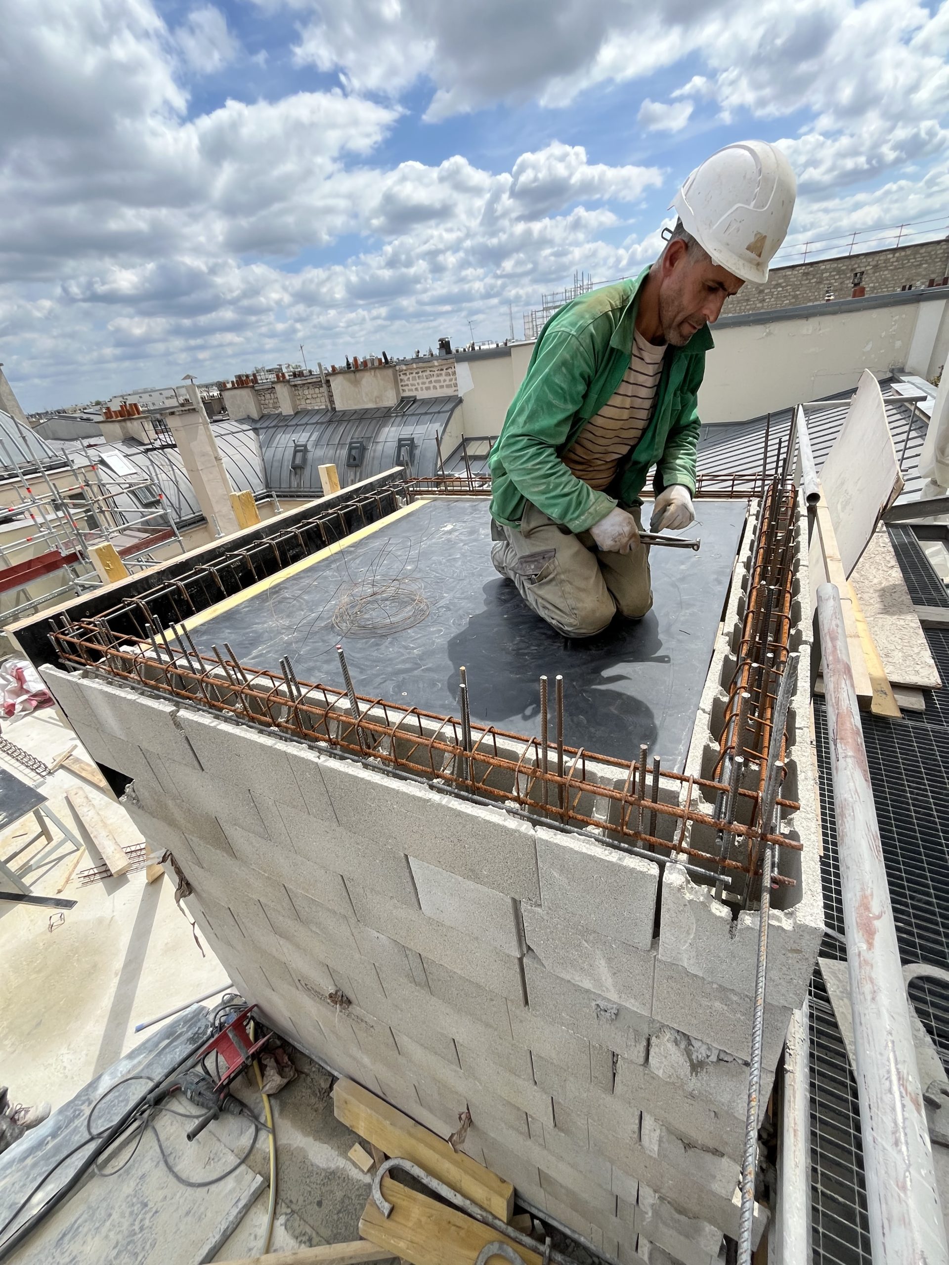 Prolongation d’une gaine d’ascenseur en blocs à bancher pour accéder au roof top nouvellement créé.